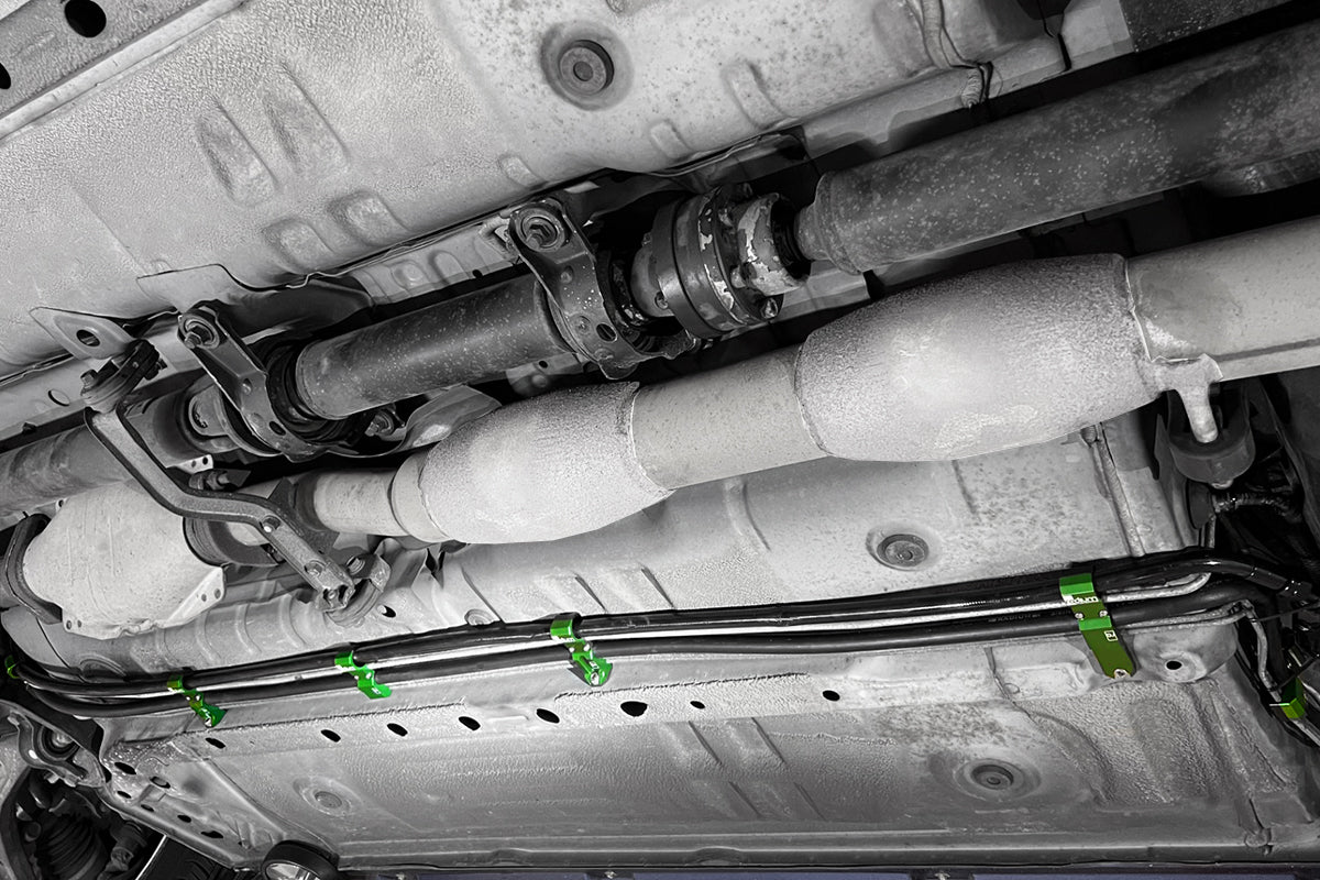 A long 8AN PTFE fuel line adapts at the rear of the vehicle to the 8AN PTFE fuel line in the fuel hanger connection kit. This new 8AN PTFE fuel line runs all the way up engine bay and mates to a Radium fuel filter mounted in the OEM location. The provided short 8AN PTFE fuel line routes from the fuel filter to the inlet of an aftermarket fuel rail (not included). A fuel pressure gauge and a Radium DMR mount to the fuel rail outlet. From here, a 6AN EFI hose route all the way back to the 6AN PTFE fuel line from the fuel hanger connection kit. All lines are secured using the included biller fuel brake line retainers.