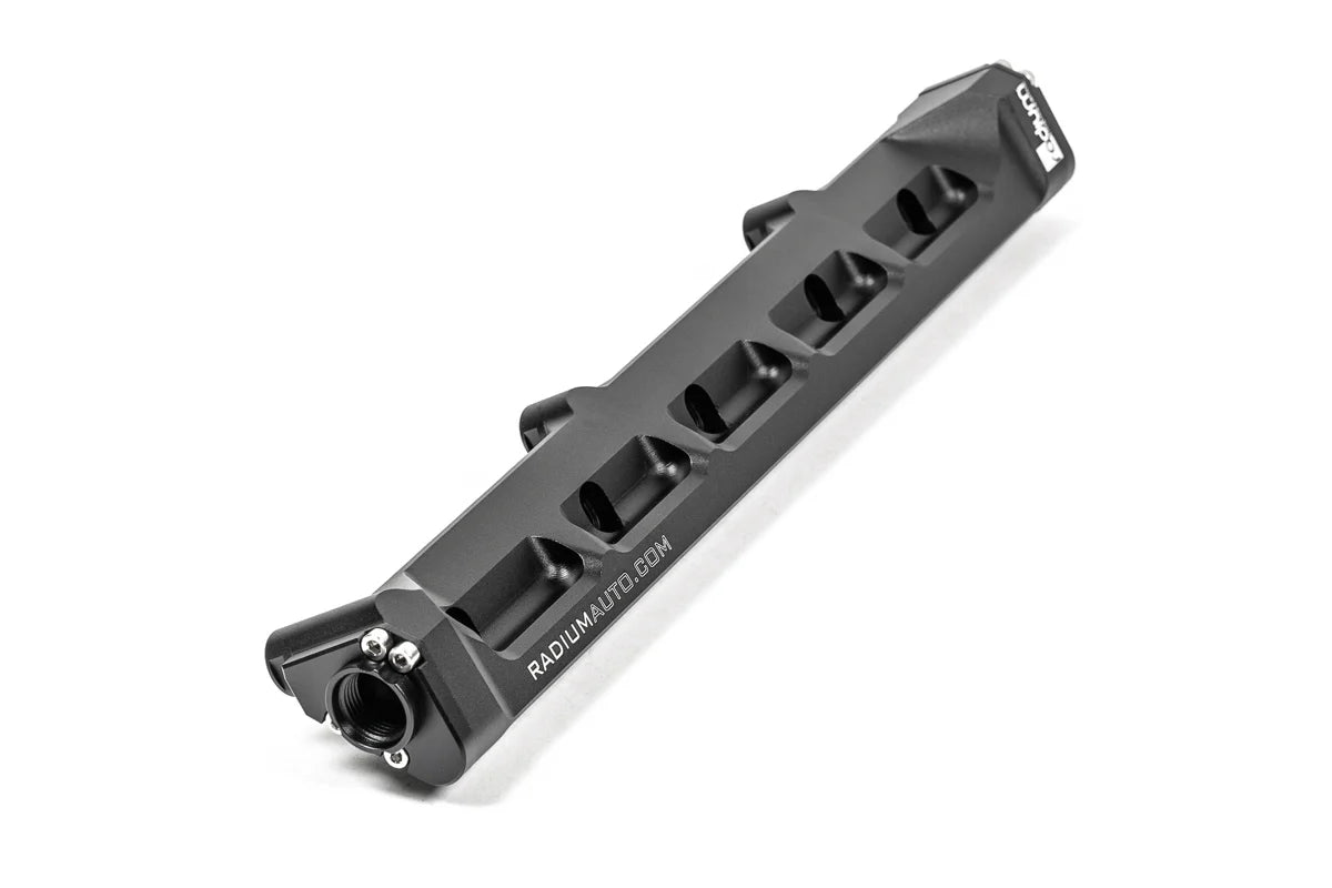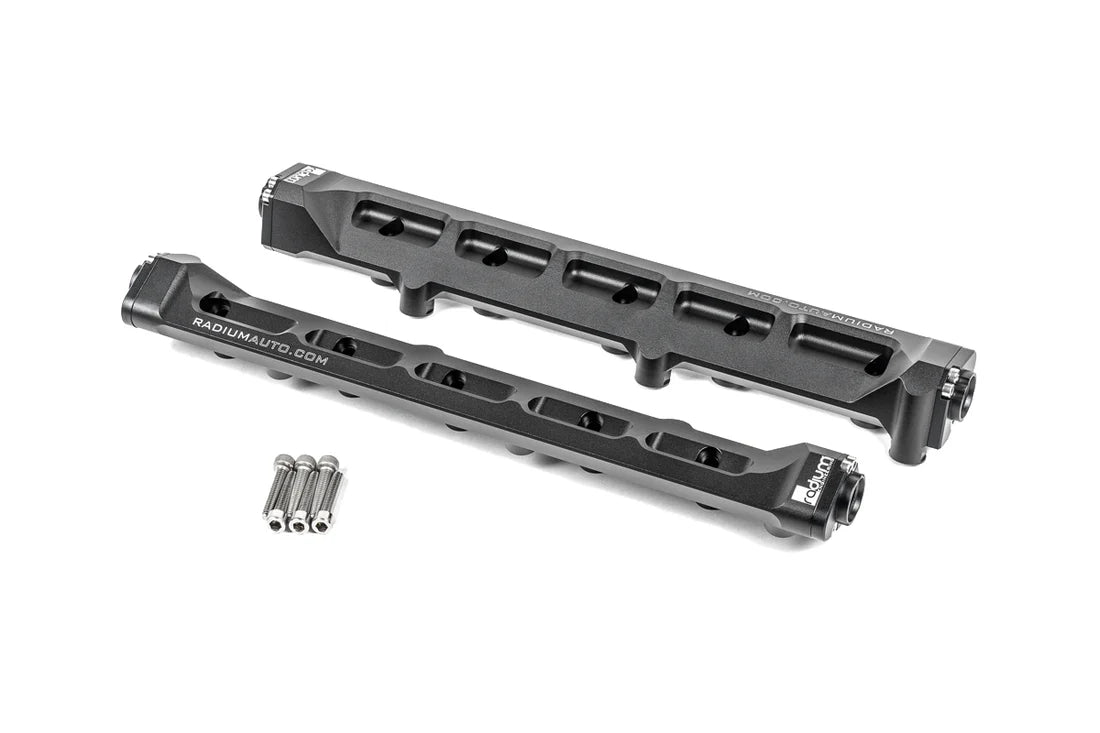 Radium Engineering fuel rails are manufactured with dual 3/8" (6AN) internal bores that internally connect to all injectors. Combined, these dual bores are 12% larger than a single 1/2" (8AN) bore. This system can support all necessary engine power requirements and is compatible with all alternative fuels.